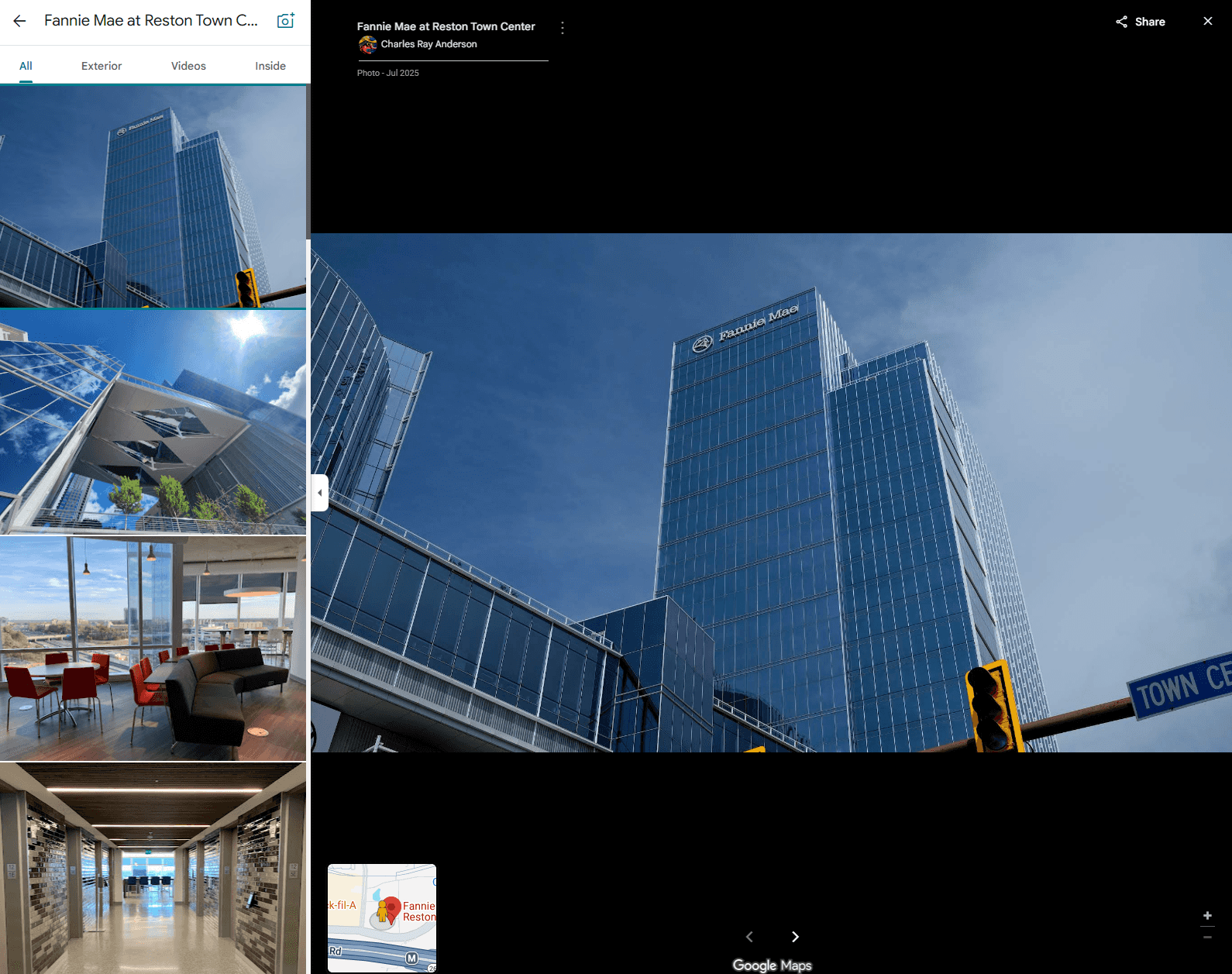 I looked through the images briefly, and noticed that it was on some rooftop of a tall building. However, what instantly gave it away was the fourth image. I instantly recognized the company to be Fannie Mae, a large government-sponsored enterprise that gives out mortgages. Doing a quick search on Google Maps gave: